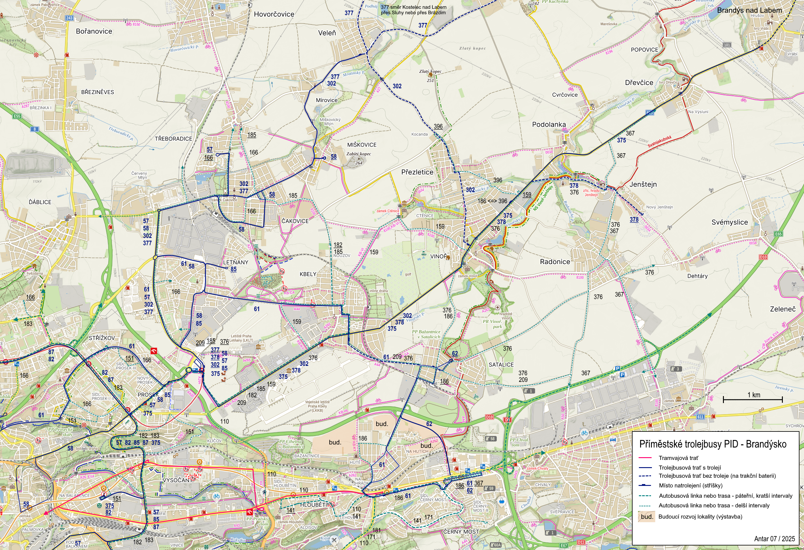 a 377 parciální trolejbusovou trakcí, a to v tradiční trase přes Kbely, Vinoř a Dřevčice
